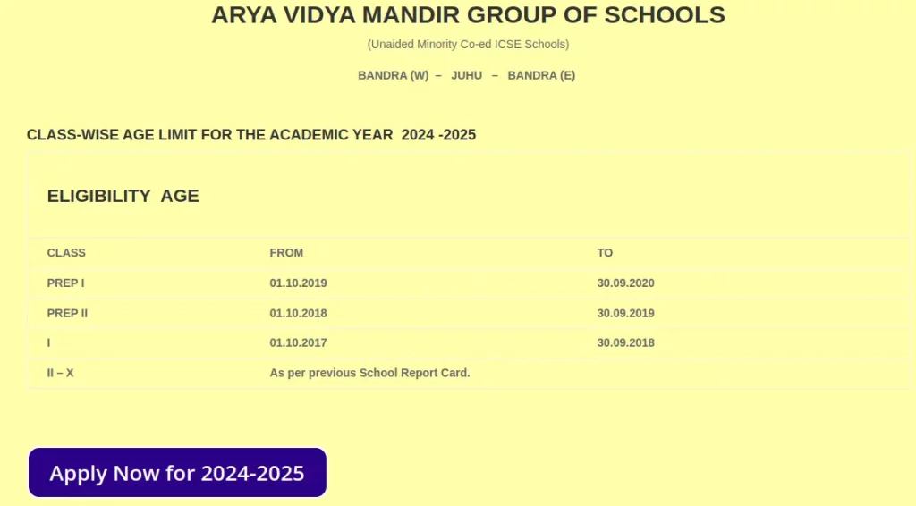 | Residence Zone | Each of the Arya Vidya Mandir Schools has a specific set of pin codes. Children whose residences are in this set of pin codes are only eligible to apply. |