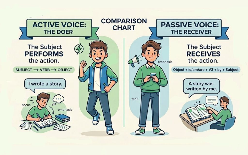 Good grammar can help you score better in exams. Many students get confused with active and passive voice rules because of tense, verb forms, and sentence structure. Active voice means the subject does the action, while passive voice means the subject receives the action. You can follow simple rules like switching subject and object, using the correct helping verb, and changing the verb to the V3 form to convert sentences easily.