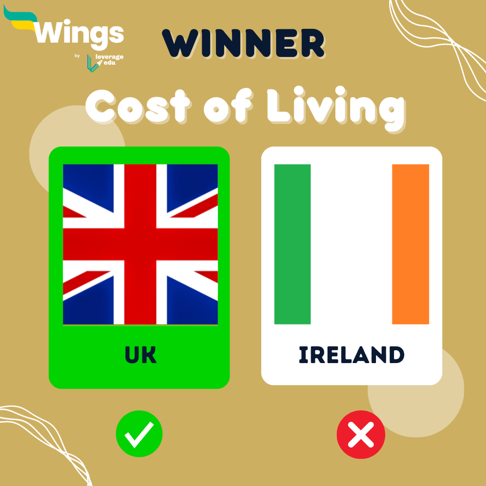 The above comparison shows that the cost of living in the UK is more than the cost of living in Ireland. Hence, Ireland will receive +2 points in this round of UK vs Ireland.